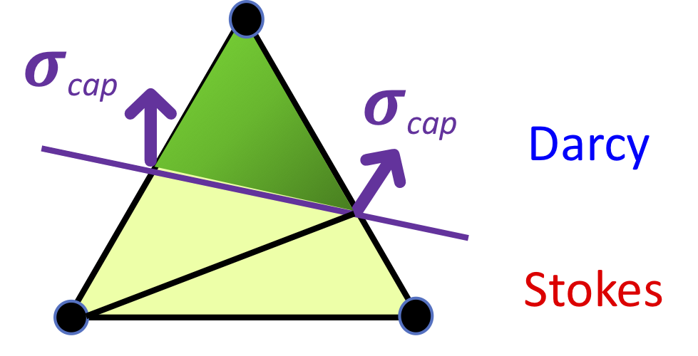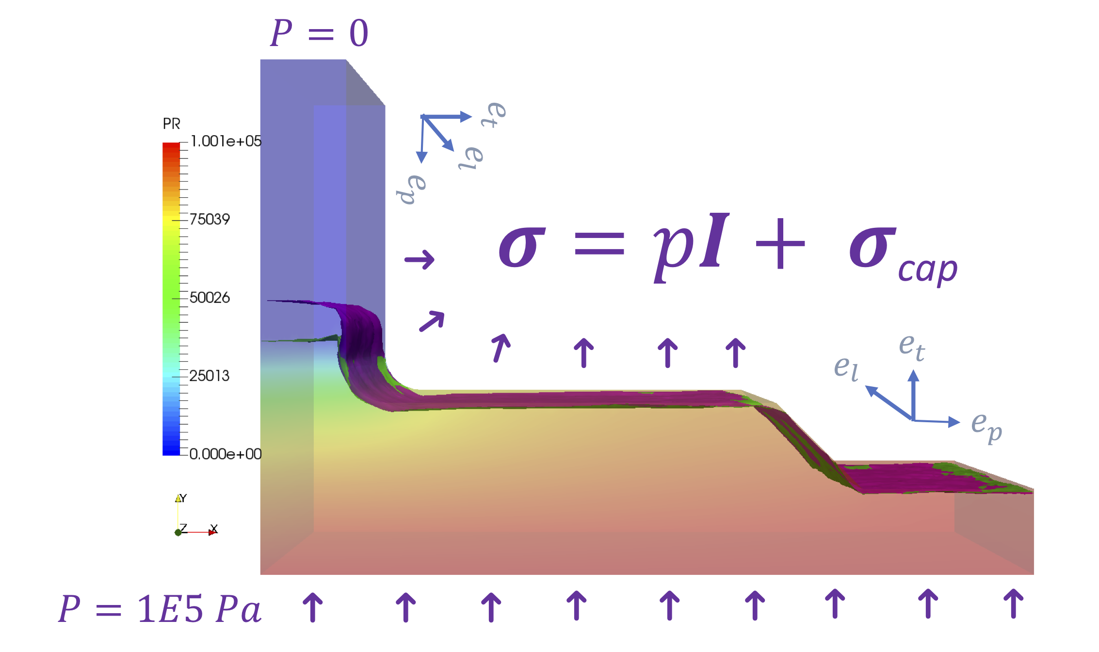 What type of two-phase flow representation, depending on the medium size compared with the charactertistic size of the RVE : (right) homogeneous equivalent medium (Darcy) can be used with proper stochastic permeabilities (stationary and transient, potentially dependent on the Ca regime), capillary pressure and saturation (porisity map), or (left) DNS required but may be converted to Darcy’s-like (if necessary) response from pressure drop vs velocity response. (centre) too strong discontinuities in the micro-structure require DNS with no possible equivalence.