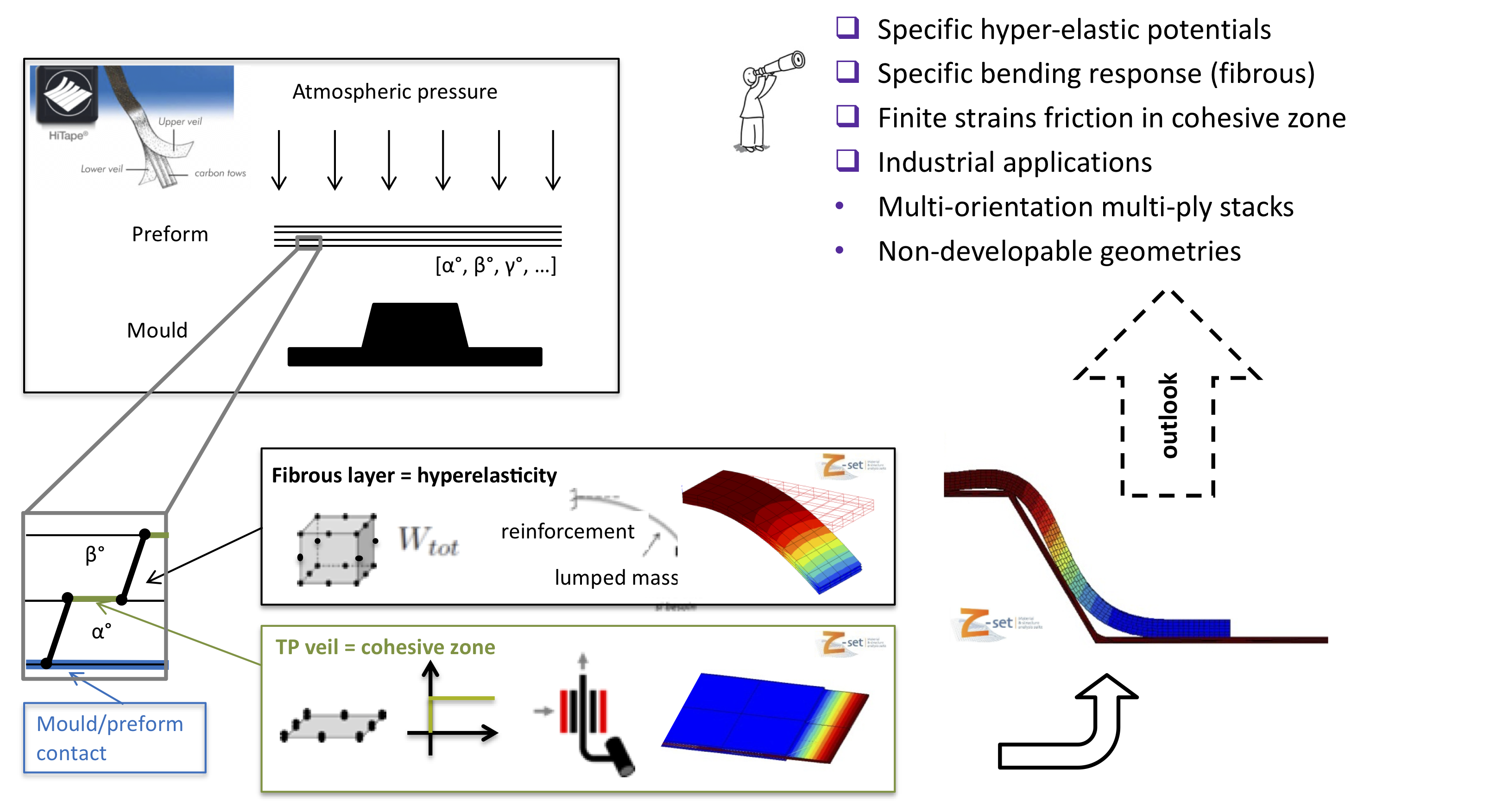 HiTape(R) forming simulation with Abaqus(R): single ply representation with embedded membrane FE into CSS8 solid-based shell elements for membrane-bending decoupling + non-linear bending relationship + anisotropic constitutive laws. Cohesive surfaces for the interface representation in ply stackings. Finite transformation framework.