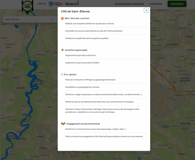 Un partenariat a également été établi avec le restaurant du Centre Hospitalier Universitaire (CHU) de Saint-Étienne, offrant ainsi aux personnels du campus du CIS un accès facilité à une restauration de qualité. Ce restaurant, labellisé « Mon Restau Responsable », s’inscrit dans une démarche de restauration durable. Il propose des « assiettes responsables », composées majoritairement de produits issus de l’agriculture biologique, locaux ou de saison.