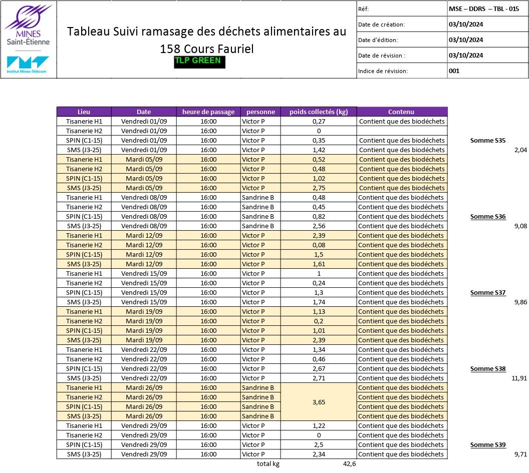 En complément, Mines Saint-Étienne a lancé en septembre 2024 une expérimentation sur son campus de Saint-Étienne en installant quatre points de collecte de déchets alimentaires. Cette initiative a permis de quantifier les biodéchets produits, atteignant 42,6 kg en un mois. Ces dispositifs sont toujours en place à ce jour, contribuant à une meilleure évaluation des déchets et à la sensibilisation des usagers.
