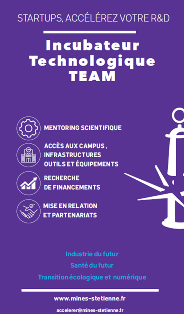 TEAM (lien web site web de l’incubateur TEAM) accompagne la maturation technologique et scientifique liée à la création de start-up innovantes, en complémentarité avec les structures d’accompagnement du territoire qui accompagnent plus spécifiquement le volet économique (incubateurs, accélérateurs, pépinières innovantes, agence de développement économique etc..)