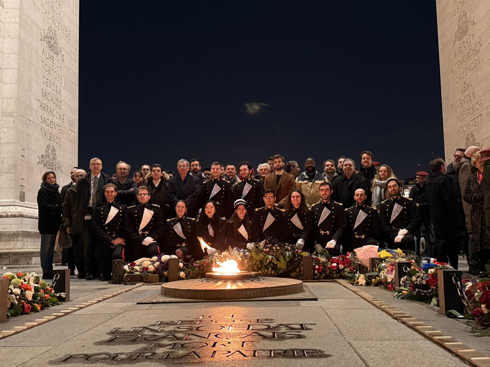 La Sainte-Barbe ne se fête pas qu’à Saint-Étienne. Pour preuve, une quarantaine d’alumni se sont retrouvés à Paris sous l’Arc de Triomphe, jeudi 4 décembre dernier, pour participer à la cérémonie de ravivage de la Flamme sur la tombe du Soldat inconnu. Accompagnés par Krzysztof Wolski, directeur des formations, et Delphine Baron directrice du Mécénat à la Fondation IMT, certains portaient le costume de l’École pour célébrer, honorer et entretenir l’Histoire.